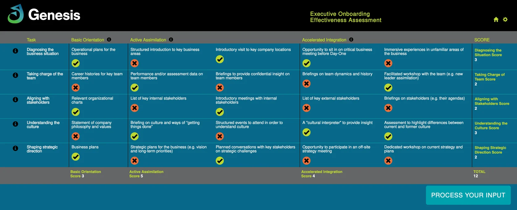 Take our Executive Onboarding Effectiveness Assessment to find out how well your organization supports newly-hired leaders compared with our global sample and clearly identify what you can do to accelerate the integration of new talent today. Visit our Solutions Page for more information on how Genesis accelerates transitions and take cost-effective steps to get your leadership talent up to speed 50% faster.