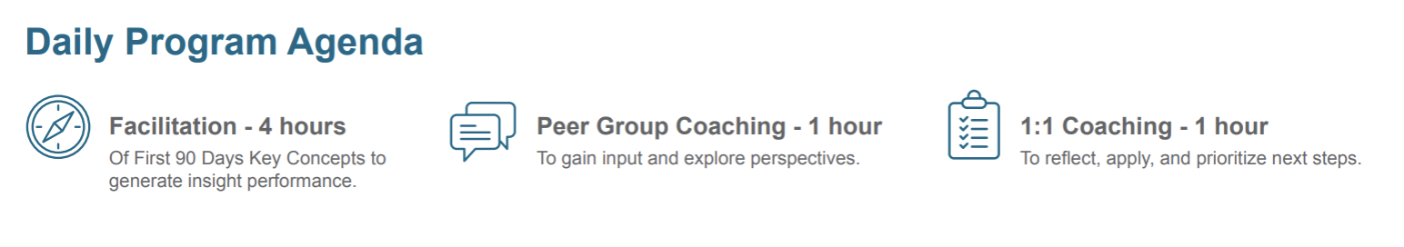 Over three high-impact days, participants move through structured learning cycles designed to accelerate their transition. Each cycle combines essential leadership concepts, peer collaboration, and one-on-one coaching—guiding participants to build actionable transition plans they can implement immediately.