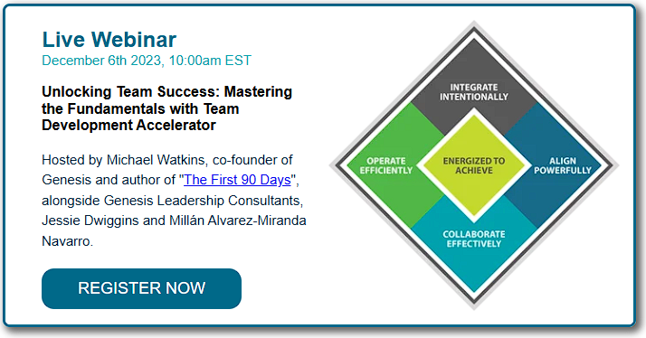 Building upon Michael Watkin’s quintessential First 90 Days® Framework, our Team Development Accelerator™ delivers a comprehensive approach that combines proven concepts and tools, expert design, facilitation, and coaching to accelerate team development. Our five essential pillars enable teams to integrate intentionally, align powerfully, collaborate effectively and operate efficiently to become energized to achieve.